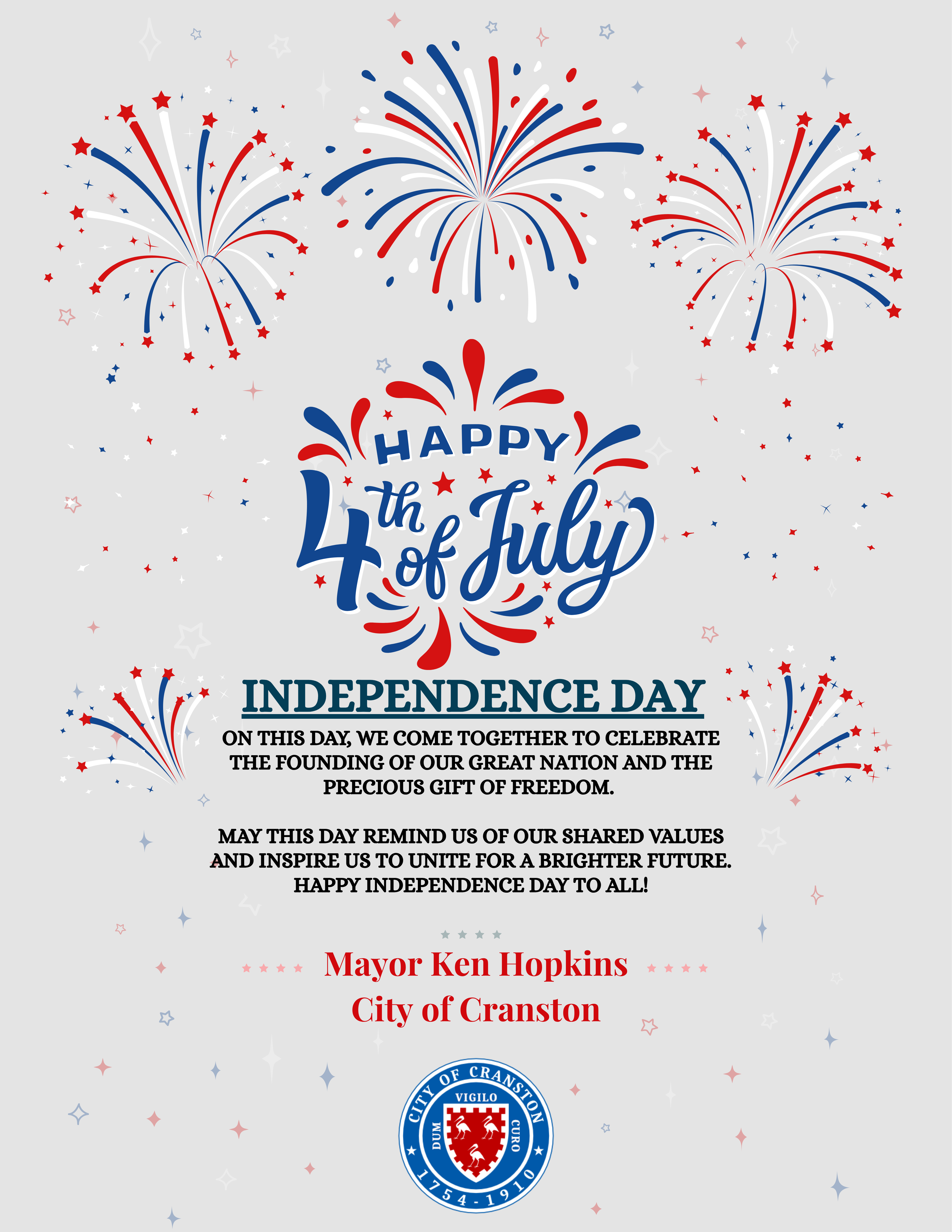 Happy Fourth of July, Cranston! Wishing each resident joyful and safe holiday celebrations!