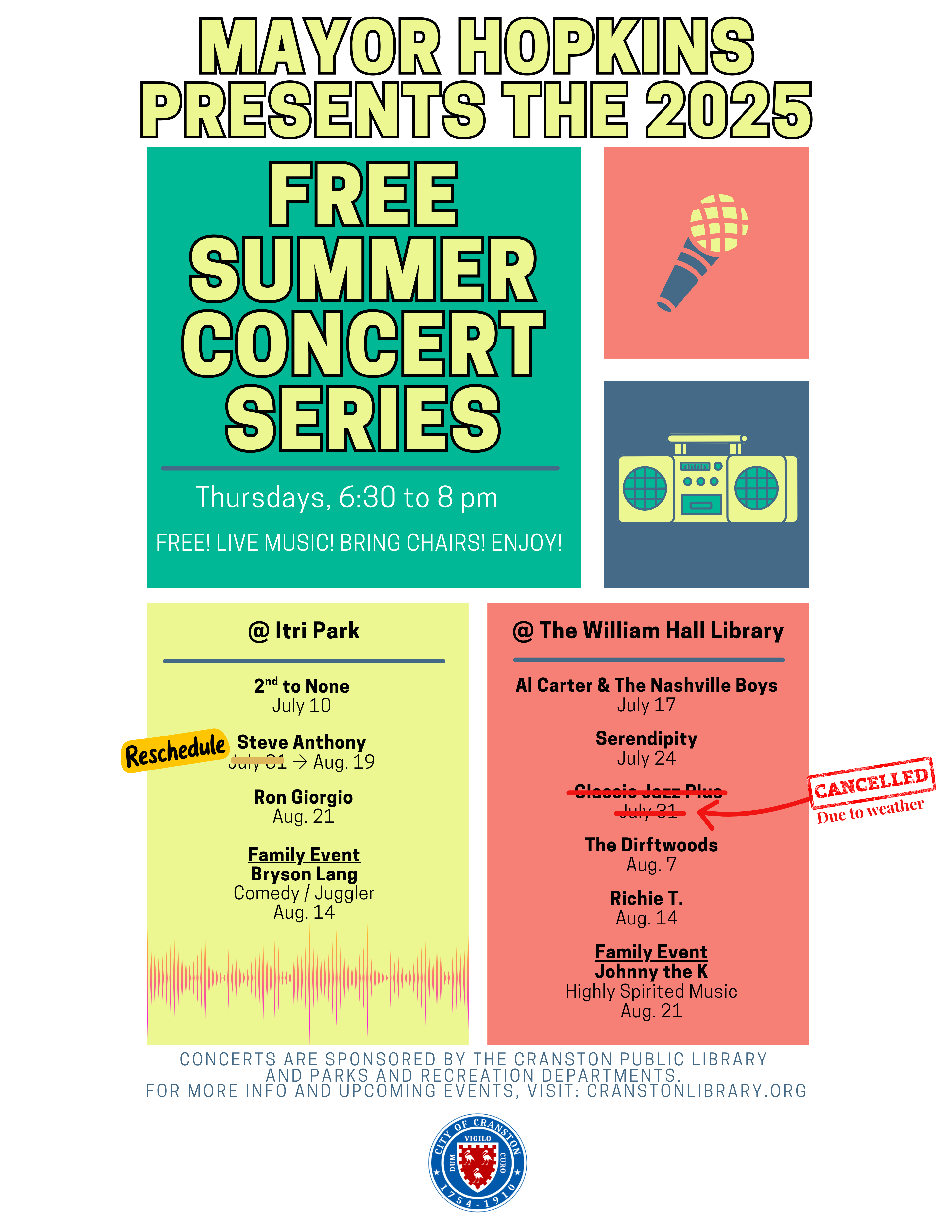 Mayor Kenneth J. Hopkins Announces the 2025 Cranston Summer Concert Series