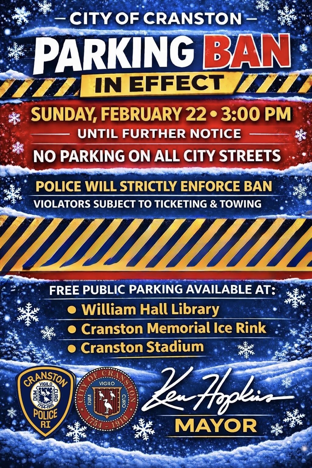 There is a citywide parking ban from 2/22 until further notice, due to the historic snowstorm dropping 39 inches of snow on Cranston. Please keep vehicles off the streets to allow plows to clear...