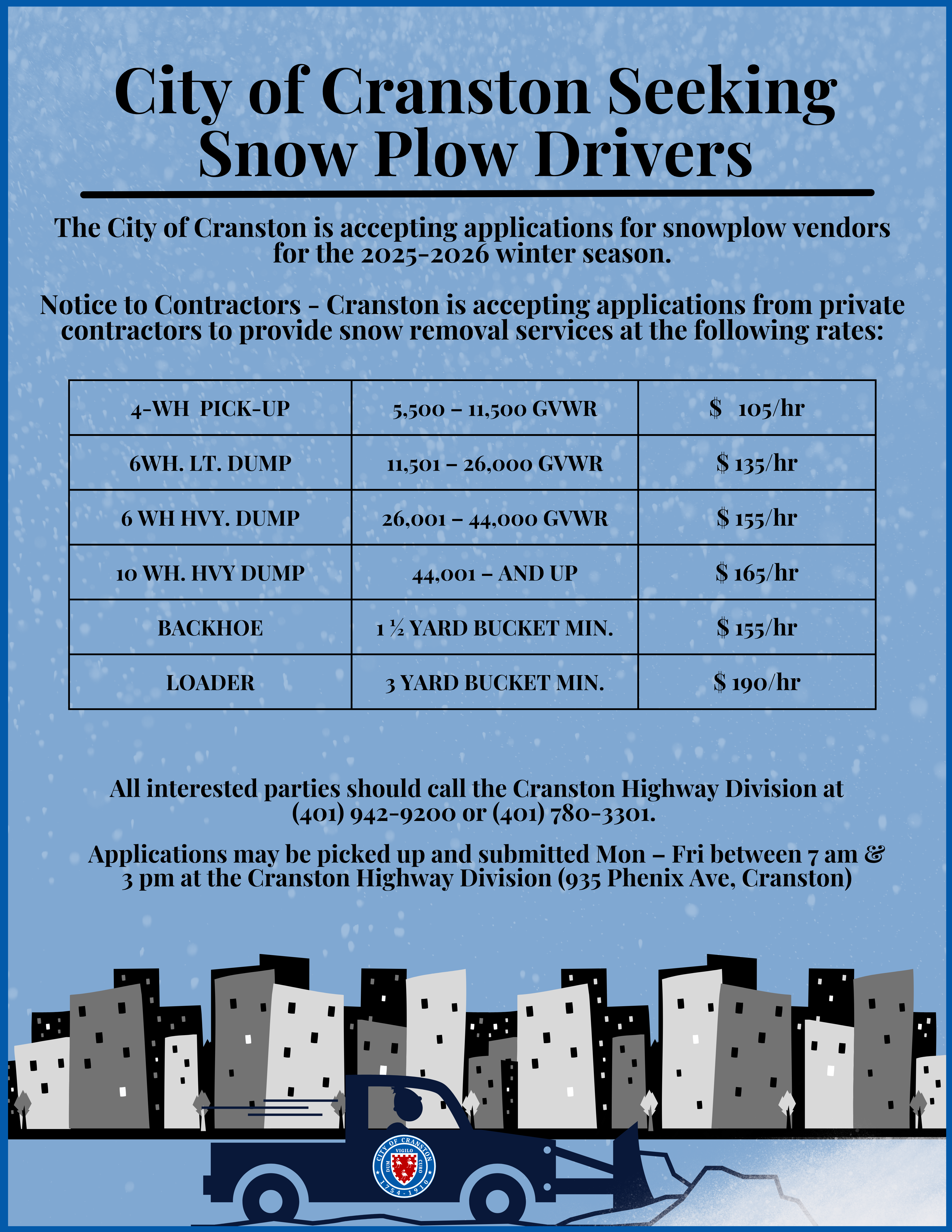The City of Cranston is accepting applications for snowplow vendors for the 2025-2026 winter season.