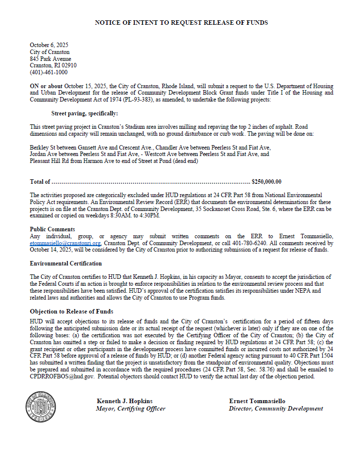 The City of Cranston shares this Notice of Intent (NOI) to Request Release Of Funds (RROF) for Stadium Area Street Paving. Download the document below.