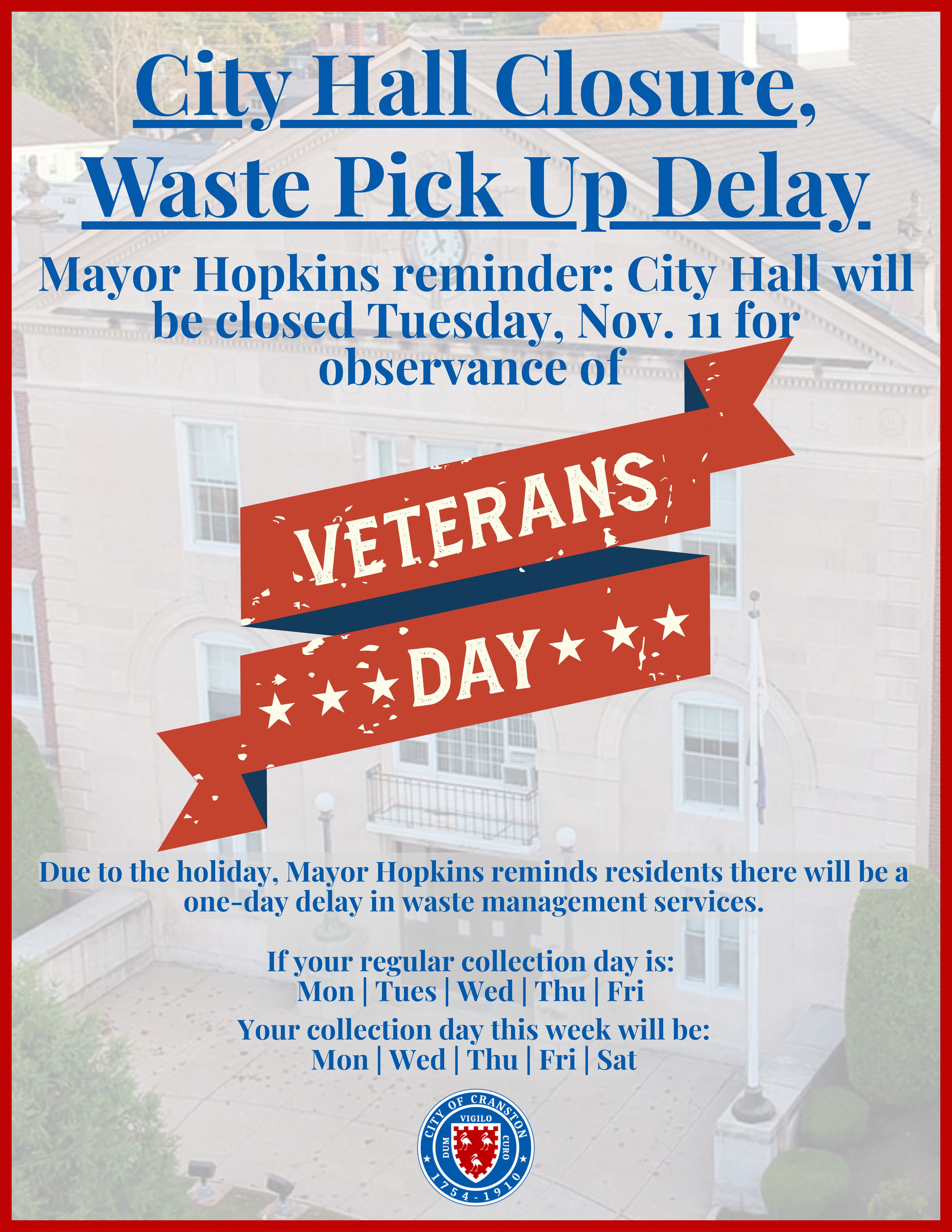 Mayor Hopkins reminder: City Hall will be closed Tuesday, Nov. 11 for observance of Veterans Day. Due to the holiday, Mayor Hopkins reminds residents there will be a one-day delay in waste management services.