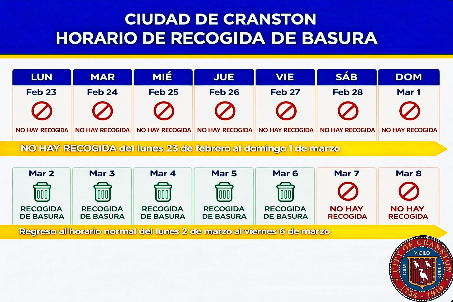 Trash collection in Cranston is suspended for the remainder of the week to support snow removal operations.